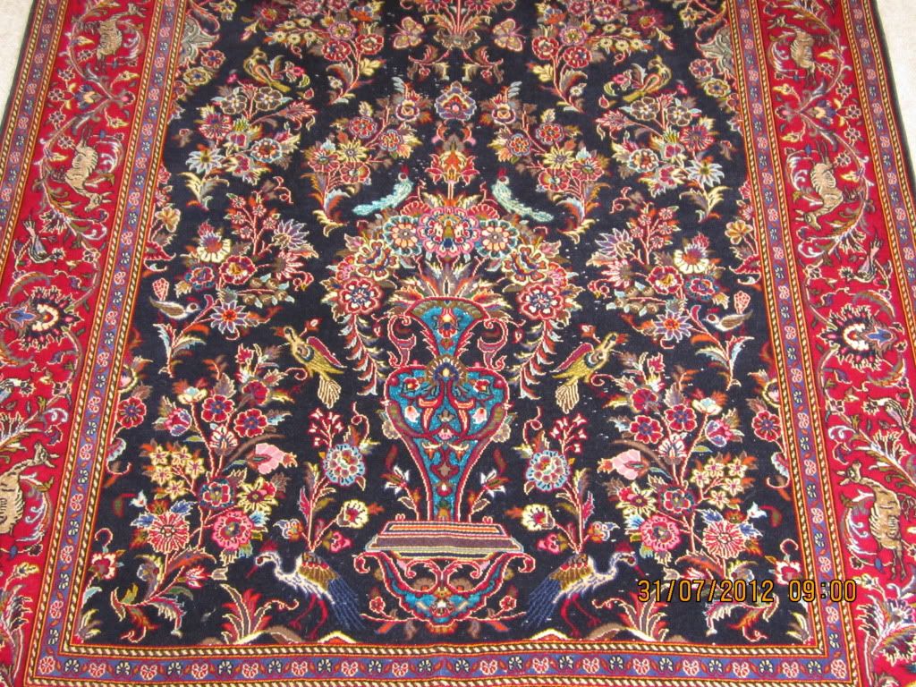 After that the knotting starts. After one row of knots the weft (s) will be addad to the construction. In your rug there are 2 wefts in opposed direction worked into the rug. One is a thin blue cotton weft, one is a thick white cotton weft.