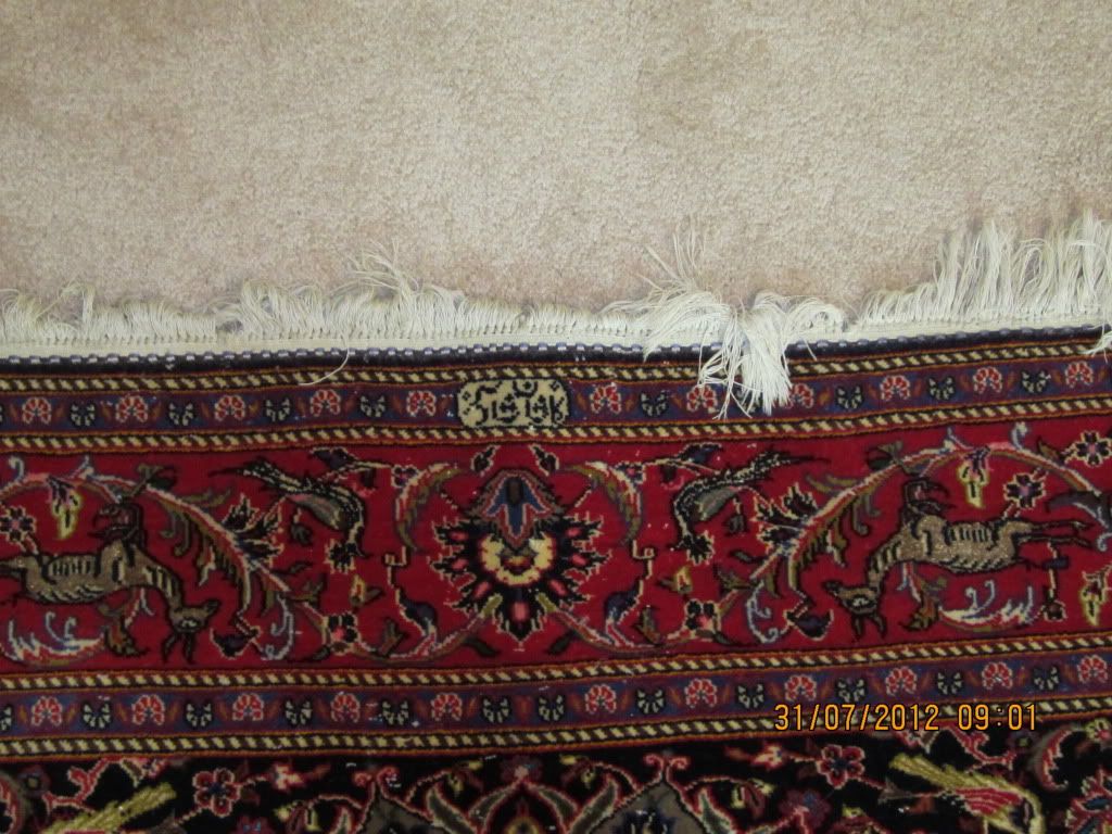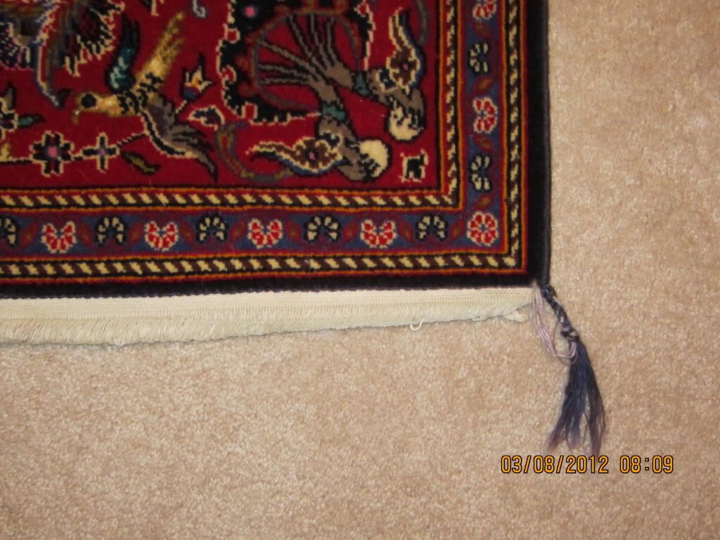 If you make a rug, you first set the loom by attaching the warp - in this rugs case a fine cotton warp. The warp material is not endless, when the string ends it must be tied toghether with the next.
